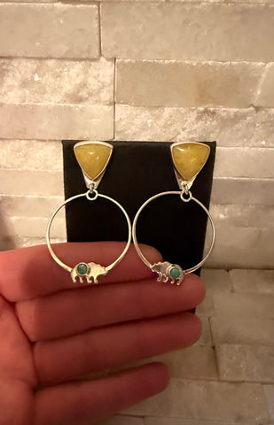 These fun bear hoop dangle earrings feature sunny yellow aventurine tops set in sterling silver, paired with airy bear hoop bottoms accented with turquoise. Lightweight and truly unique, they’re comfortable enough for everyday wear yet eye-catching enough to dress up your favorite outfit—whether casual or dressed up. This pair carries easy bear-inspired vibes with a playful, natural feel.