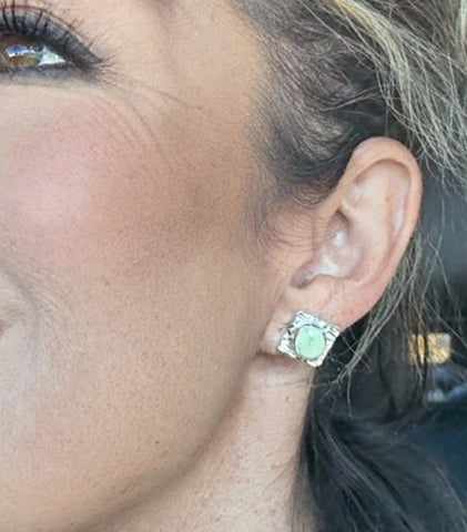 Add a touch of natural elegance to your look with these gorgeous light lime green serpentine earrings, beautifully set in sterling silver. This pair was handmade with love, featuring delicate hand stamping along the edges for a unique artisan finish.