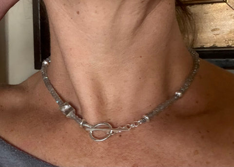 Elevate your look with this gorgeous gray moonstone choker, featuring faceted stones that beautifully catch the light and sparkle with every movement. This piece is finished with a stylish handmade sterling silver clasp and a unique triangular hand-stamped silver bead for a touch of artisan charm.